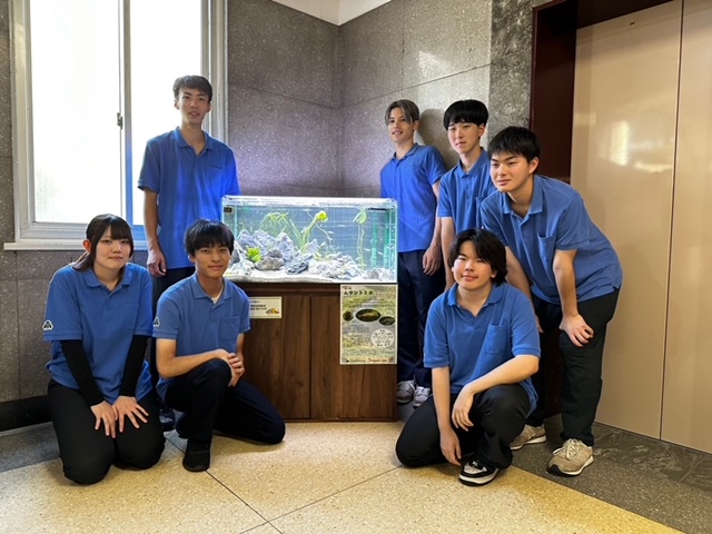 埼玉県の「ネイチャーポジティブ」推進は希少種保護等により、生物多様性の損失を止め、反転させる活動で、学生たちもその学びの一環として啓蒙活動に参加いたします。普段から行っている水槽展示ではありますが、緊張した面持ちで設置していました。